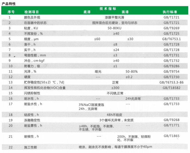本產(chǎn)品具有干速快、施工性優(yōu)異、無(wú)閃銹、防腐性能優(yōu)異,耐鹽霧性能可達(dá)到120小時(shí)以上(厚度100+10um,耐候性能優(yōu)異室外曙曬1年不粉化、不剝落??芍苯油垦b在表面有輕微油污的鋼結(jié)構(gòu)上,不會(huì)影響外觀及附著力。含有醇酸底漆、醇酸底面合一漆、醇酸調(diào)合漆、也醇酸磁漆等4大類產(chǎn)品。